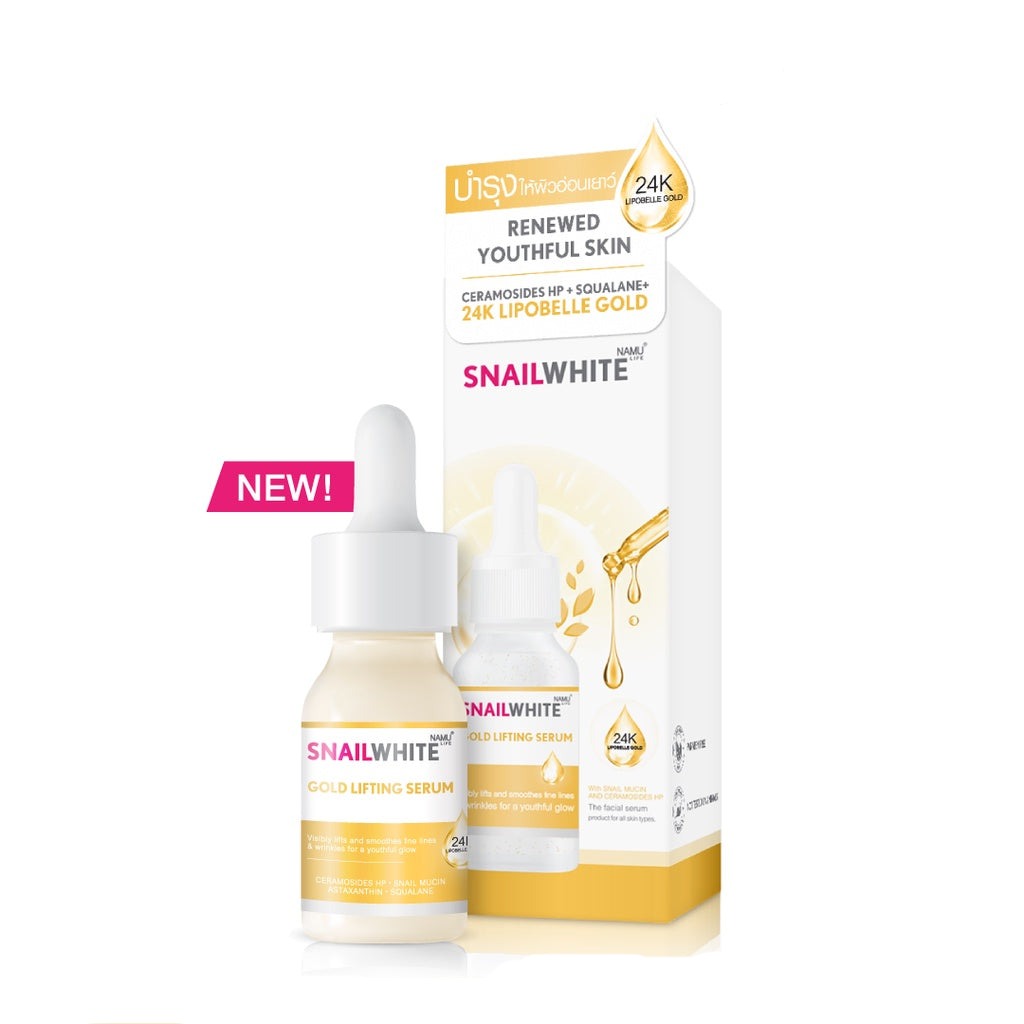 Namu Life Snail White Gold Lifting Serum is designed to combat wrinkles, black spots, dullness and lifeless skin.