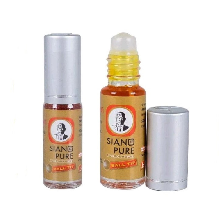 Siang Pure Oil Formula 1 (Ball Tip) is the original amber oil formula, has a strong signature herbal aroma comprised of Cinnamon and Clove oil. For dizziness, feeling faint, nasal congestion, stomach bloating, muscle and joint pains and sprains, bruises and also itches from mosquito and other insect bites.